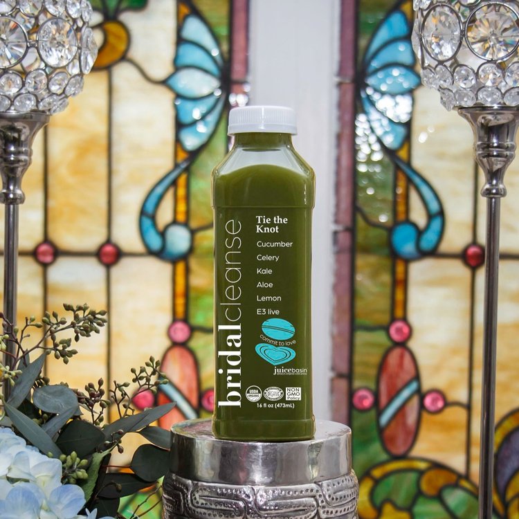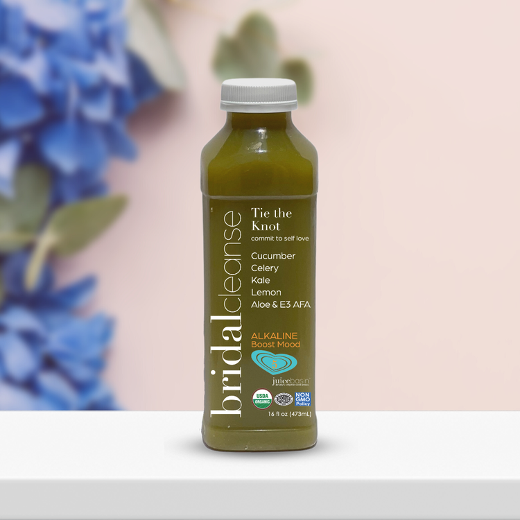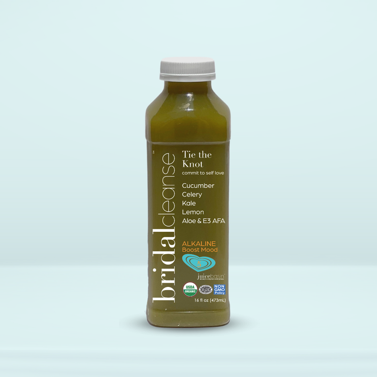 Break down sugars, eliminate fats and starches with Tie The Knot - the fifth fresh juice of The Bridal Cleanse™ regimen. The fresh organic ingredients are aloe vera, celery, cucumber, lemon, & e3 live AFA. The juice taste is light yet slightly bitter. Its purpose is sugar elimination. The benefit is improve clear skin and cleanse the colon. Handmade fresh in Asbury Park, NJ.
